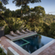 Contending with the steep slopes and more than 29’ of grade change in the rear yard posed the biggest design challenge in terms of connecting the house and recreation areas below. The solution being a stair sequence that floats above the natural grade, preserving the existing oaks with expanded landings that encourage moments of pause amid the tree canopy while enjoying the views of the pool below. The materials selection of the stairs (Thermory wood and custom railings) references the tree trunks and branches that one is immersed in as you descend to the pool deck below.
